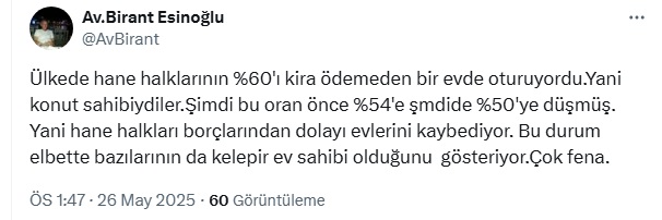 Avukat Birant Esinoğlu da sosyal medya hesabından, ev sahipliği oranının gittikçe azaldığını söyledi. Öte yandan binlerce kişinin borçlarından dolayı evlerinden olduğunu aktarsn Esinoğlu ''Bu durum elbette bazılarının da kelepir ev sahibi olduğunu gösteriyor.Çok fena.''dedi.