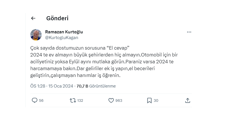 2024 te ev almayın büyük şehirlerden hiç almayın.Otomobil için bir aciliyetiniz yoksa Eylül ayını mutlaka görün.Paraniz varsa 2024 te harcamamaya bakın.Dar gelirliler ek iş yapın,el becerileri geliştirin,çalışmayan hanımlar iş öğrenin.''