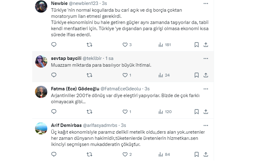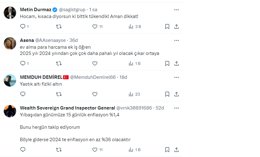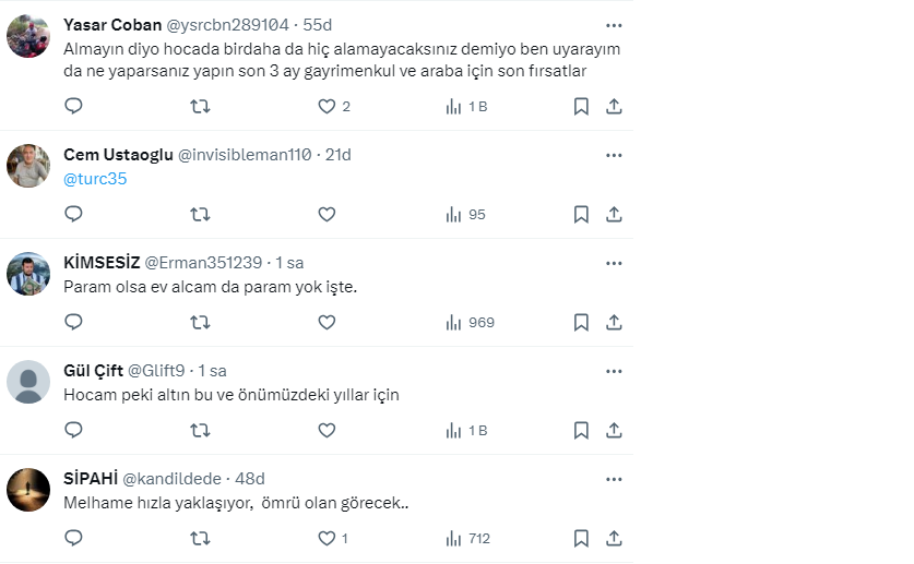 Hasan @Hasan58781014: ''Hocam kusura bakmayın öngörüleriniz mantıklı değil barınma insanı bir ihtiyaçtır nüfusumuz artıyor ve yurtdışından göç alıyoruz ve inşaat maliyetleri her gün yükseliyor dolayısıyla ev fiyatları düşmez belki bir süre yerinde kalır ama düşmez.''