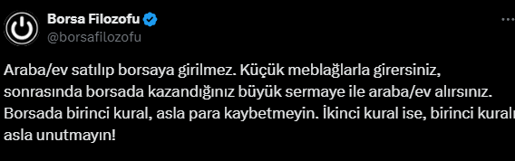 Borsa yatırımcıları her geçen gün artarak büyümeye devam ediyor. Vatandaşlar yatırım tercihini borsadan yana kullanmayı tercih ederken uzmanlar bazı konularda yatırımcıları uyarıyor. Borsa filozofu sosyal medya hesabı X'te borsa yatırımcılarını resmen uyardı. Borsa yatıımı yapmak isteyenlere seslenen uzman, ev ve araba satılarak borsaya yatırım yapılmasının doğru olmadığını söyleyerek, 2 kural açıkladı. Paylaşımının altına ise onlarca yorum geldi. İşte borsa uzmanının o açıklaması ve yatırımcılardan gelen yorumlar...