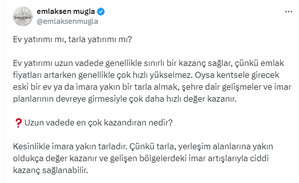 Yatırımcılar 'Ev yatırımı mı, tarla yatırımı mı?' sorusunun yanıtını merak ediyor. Uzun vadede en çk kazandıran yatırım aracı hangisi? Emlaksen Muğla isimli gayrimenkul firması sosyal medya hesabından açıkladı.