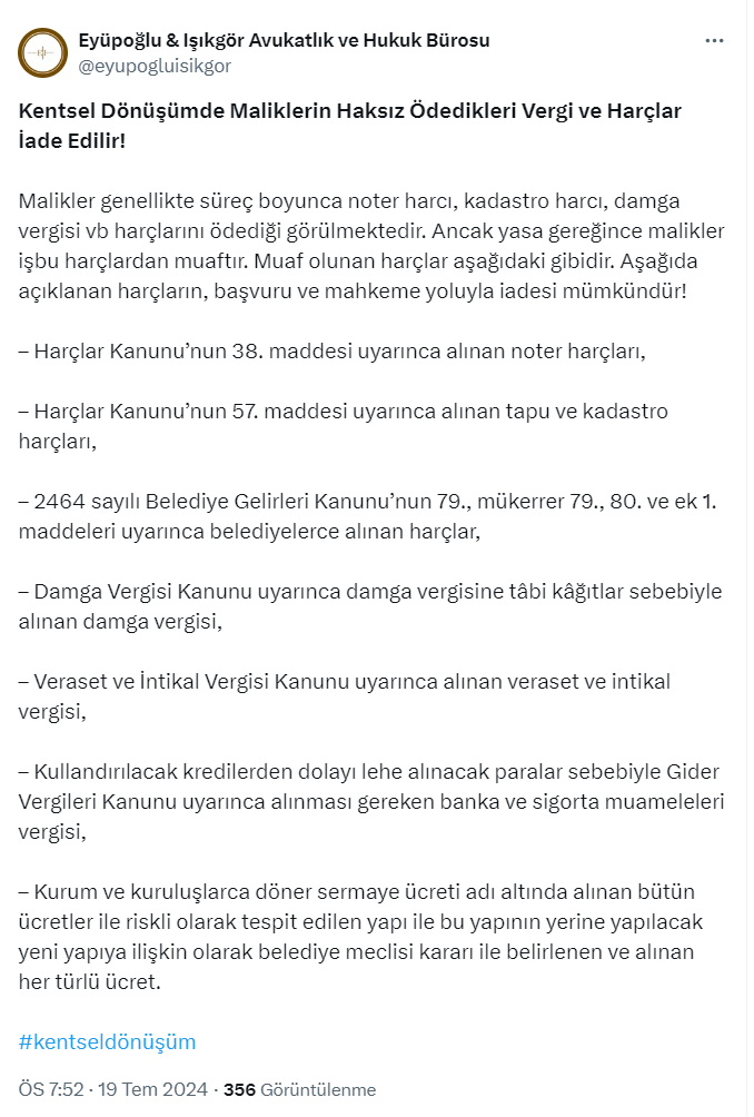 Eyüpoğlu - Işıkgör Avukatlık ve Hukuk Bürosu, resmi sosyal medya hesabı üzerinden yaptığı paylaşımda kentsel dönüşümde maliklerin haksız ödedikleri vergi ve harçların iade edileceğini kaydetti.