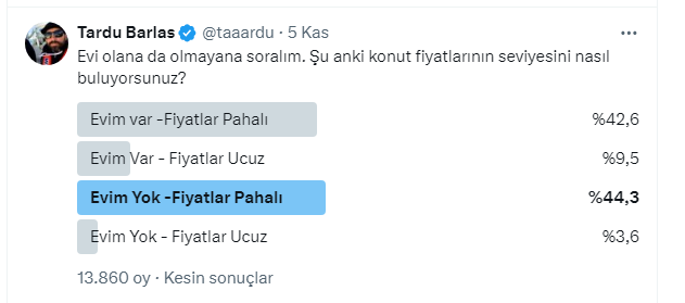 Peki vatandaş konut fiyatları hakkında ne düşünüyor? Reel araştırmacı ve temel analist Tardu Barlas, https://x.com/taaardu X sosyal medya üzerinden yaptığı ankette, evi olan ve olmayanlara şu anki konut fiyatlarının seviyesini nasıl bulduklarını sordu. 13 bin 860 kişinin fikrini açıkladığı ankette katılımcıların yüzde 86,9’u konut fiyatlarının pahalı olduğunu söyledi. Konut fiyatlarının pahalı bulanların neredeyse yarısı evi olduğunu bildirdi.