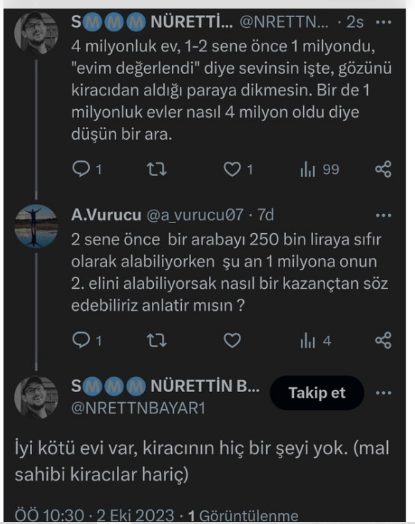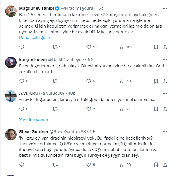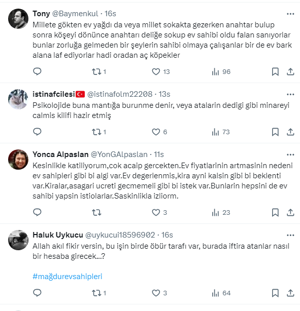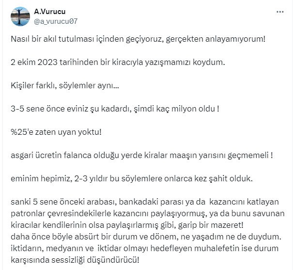 Mağdur ev sahibi ise ''sanki 5 sene önceki arabası, bankadaki parası ya da kazancını katlayan patronlar çevresindekilerle kazancını paylaşıyormuş, ya da bunu savunan kiracılar kendilerinin olsa paylaşırlarmış gibi, garip bir mazeret!'' diyerek akıl tutulması içinde olunduğuna vurgu yaptı.