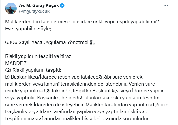 Avukat M. Güray Küçük konuyla ilgili Yasa Uygulama Yönetmeliğini sosyal medya hesabı X'ten açıkladı. Küçük ''Maliklerden biri talep etmese bile idare riskli yapı tespiti yapabilir mi? Evet yapabilir.'' yanıtını verdi.