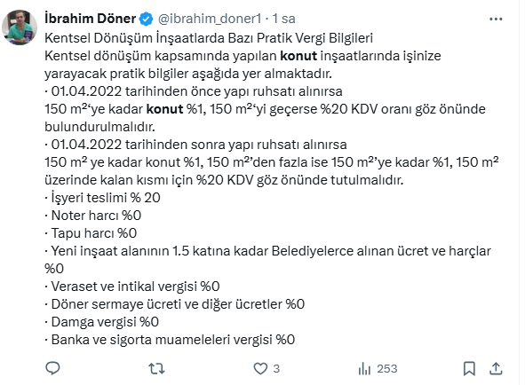 Mali Müşavir İbrahim Döner, sosyal medya hesabından entsel dönüşüm inşaatlarda ödenmesi gereken vergileri tek tek açıkladı. İşte o vergiler...