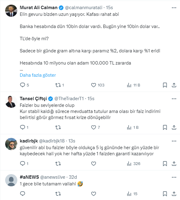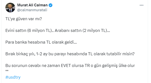 Calman Türk Lirası'na daha güvenin oluşmadığını söyleyerek, yatırımcıların parasını ne zaman Türk Lirası'nda bekletirse o zaman güvenin oluşacağını belirtti. İşte Calman'ın o paylaşımı ve gelen yorumlar...