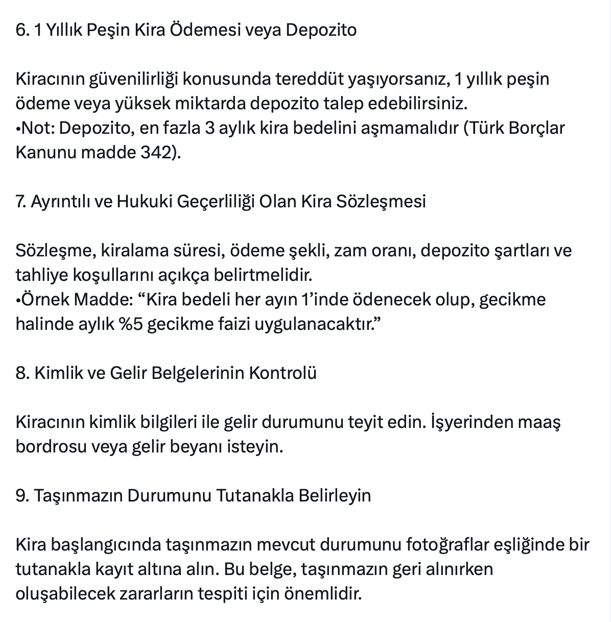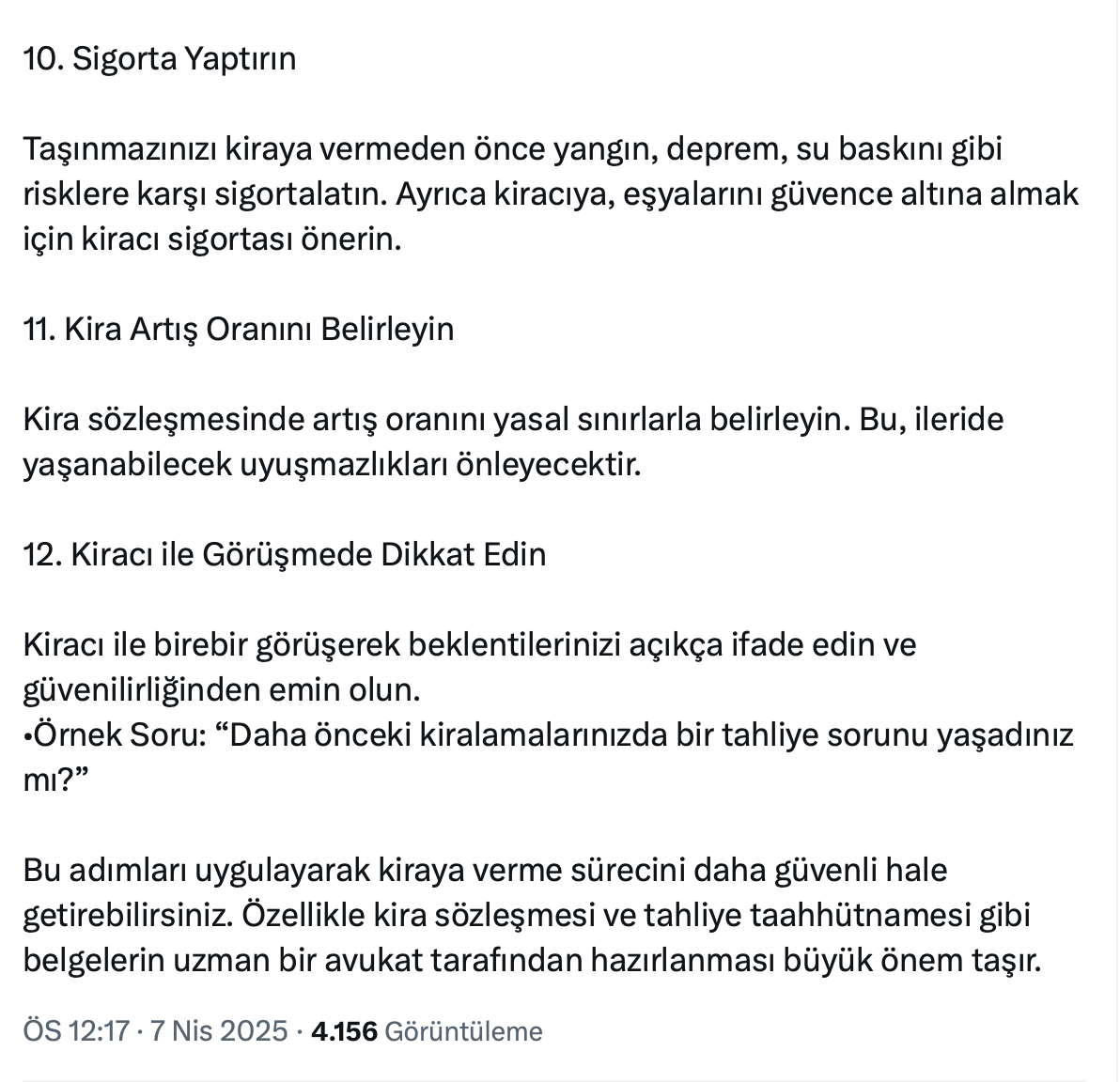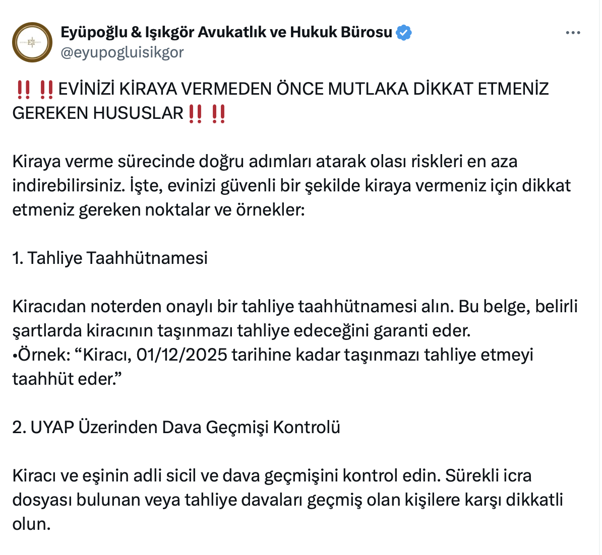 Eyüpoğlu - Işıkgör Avukatlık ve Hukuk Bürosu resmi sosyal medya hesabı https://x.com/eyupogluisikgor üzerinden yaptığı paylaşımda evinizi kiraya verirken dikkat etmeniz gereken 12 maddeyi tek tek açıkladı.