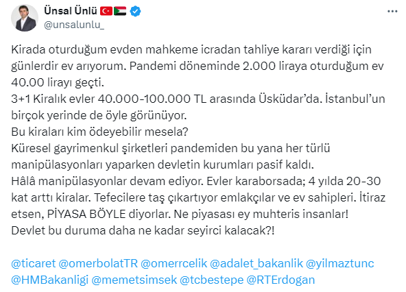 Kiralar, ülke genelinde büyük sorun haline gelirken özellikle de büyükşehirlerde kira bedelleri fahiş rakamlara ualştı. Kira bedellerindaki artışa dikkat çeken Mühendis Ünsal Ünlü, evlerin karaborsaya düştüğünü bir örnekle açıkladı.