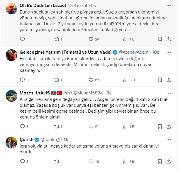Ünlü kiralara tepkisini şu sözlerle gösterdi: '' Evler karaborsada; 4 yılda 20-30 kat arttı kiralar. Tefecilere taş çıkartıyor emlakçılar ve ev sahipleri.'' dedi.