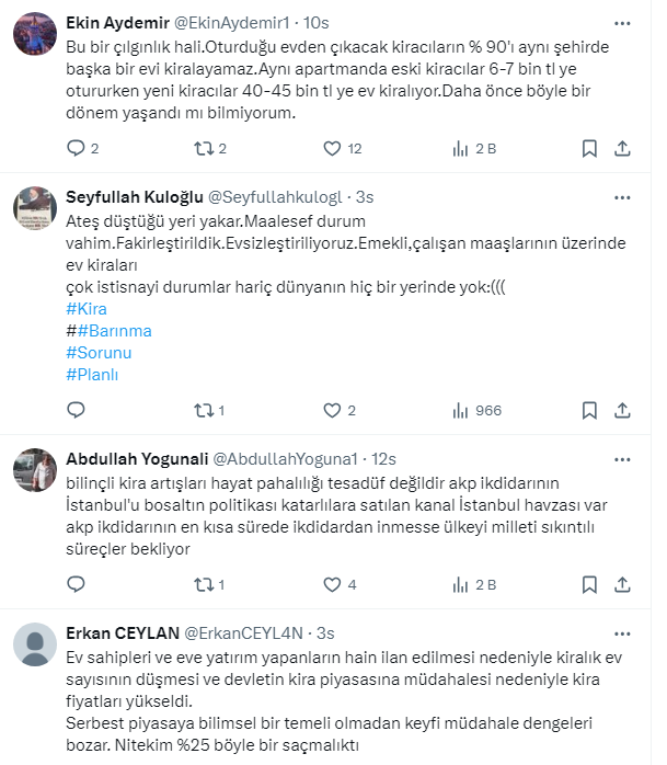 Hâlâ manipülasyonlar devam ediyor. Evler karaborsada; 4 yılda 20-30 kat arttı kiralar. Tefecilere taş çıkartıyor emlakçılar ve ev sahipleri. İtiraz etsen, PİYASA BÖYLE diyorlar. Ne piyasası ey muhteris insanlar!