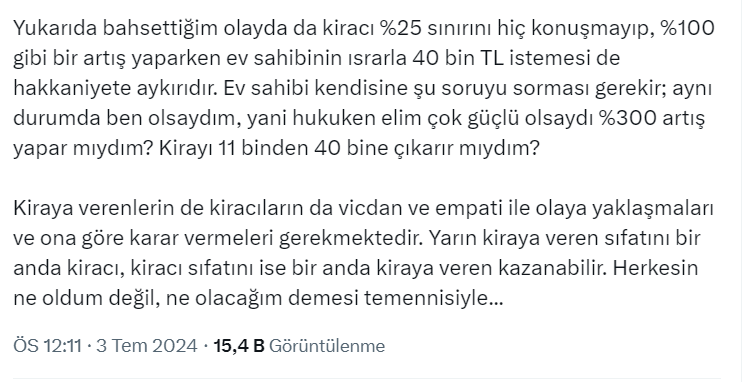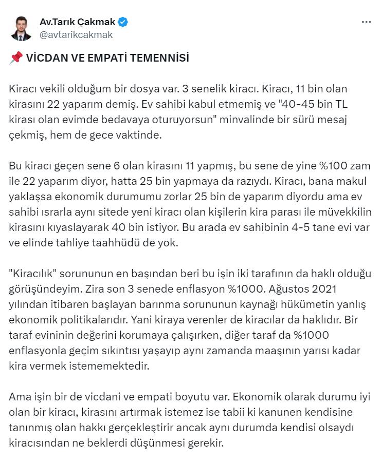 Ev sahipleri ve kiracılar arasında sular durulmazken, Avukat Tarık Çakmak da resmi X hesabı https://x.com/avtarikcakmak üzerinden yine çok konuşulacak bir paylaşım geldi. Avukat Tarık Çakmak, "Kiracılık" sorununun en başından beri bu işin iki tarafının da haklı olduğu görüşünde olduğunu belirterek, çok konuşulacak bir örnek paylaştı.