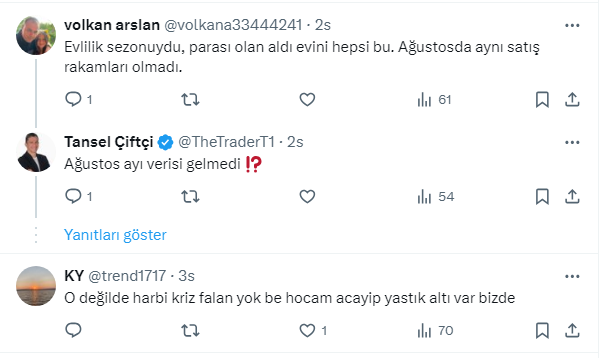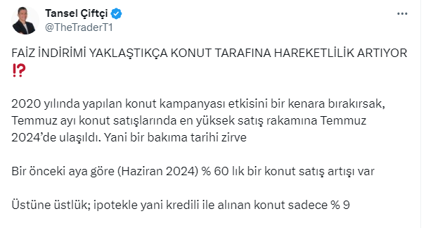 Konut satışlarında temmuz ayında yaşanan tarihi zirveye dikkat çeken trend takipçisi ve analist Tansel Çiftçi https://x.com/TheTraderT1 X sosyal medya hesabından yaptığı paylaşımda, konut sektöründe hareketliliğin devam edeceğini belirterek, nedenlerini açıkladı. Çiftçi paylaşımında şunları söyledi.