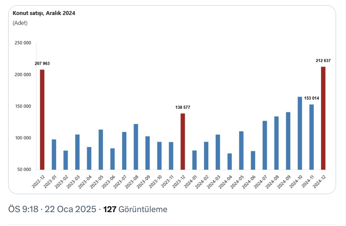 Aralık 2024'te ise satışlar bir önceki yılın Aralık ayına göre %53,4 artışla 212 bin 637 oldu.