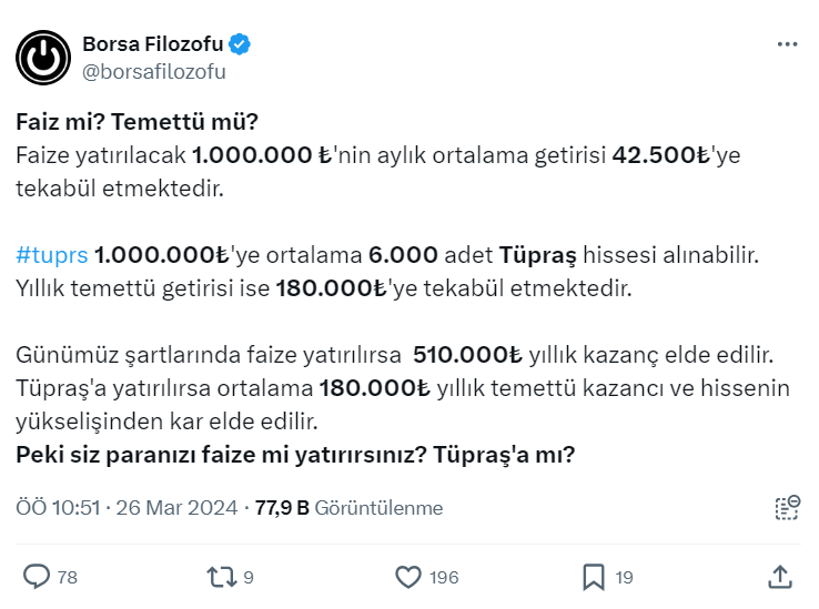Borsa ile ilgili olarak yaptığı paylaşımlarla dikkat çeken 235,9 bin takipçili Borsa Filozofu resmi X hesabı https://twitter.com/borsafilozofu üzerinden 'Faiz mi? Temettü mü?' diye sorarak önemli detaylar paylaştı.