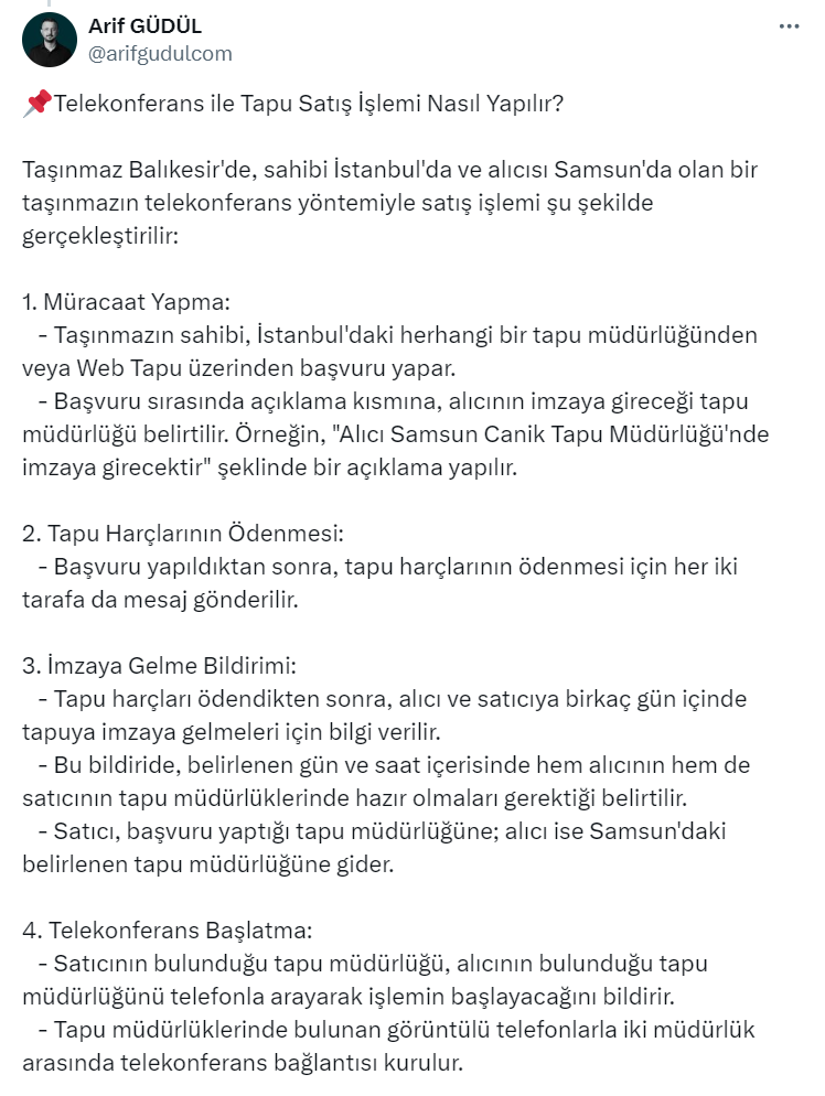 Toprak Yatırımcısı ve talepbul'un Yönetim Kurulu Başkanı Arif Güdül, resmi sosyal medya hesabı https://twitter.com/arifgudulcom üzerinden yaptığı paylaşımda telekonferans ile tapu satış işleminin nasıl yapıldığını anlattı.