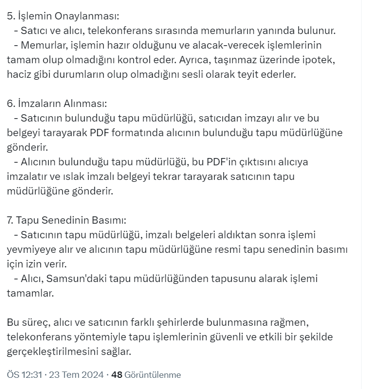 Bu süreç, alıcı ve satıcının farklı şehirlerde bulunmasına rağmen, telekonferans yöntemiyle tapu işlemlerinin güvenli ve etkili bir şekilde gerçekleştirilmesini sağlar.