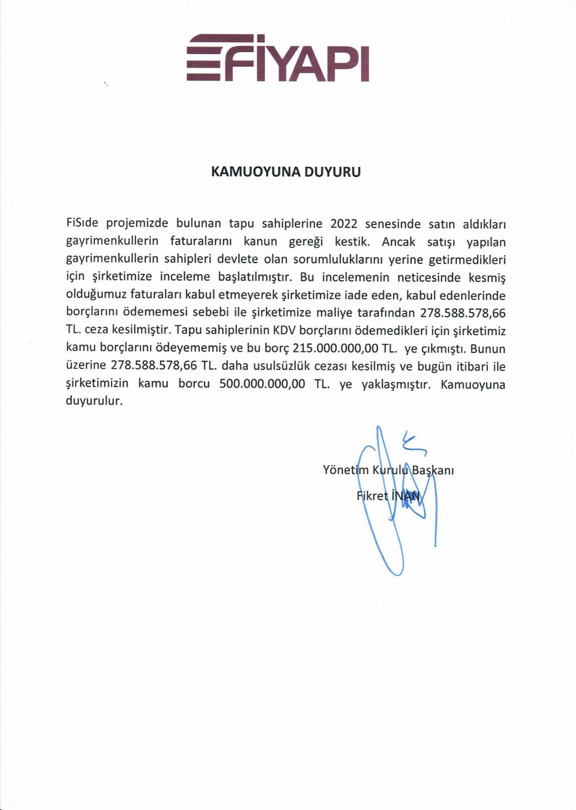 Tapu sahiplerinin KDV borçlarını ödemedikleri için Fi Yapı’nın da kamu borçlarını ödeyemediği ve bu borcun 215.000.000,00 TL’ye çıktığının belirtildiği açıklamada bunun üzerine 278.588.578,66 TL daha usulsüzlük cezası kesildiği ve bugün itibari ile şirketin kamu borcunun 500.000.000,00 TL’ye yaklaştığı duyuruldu.