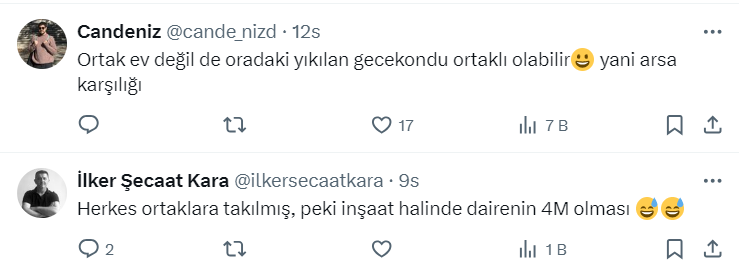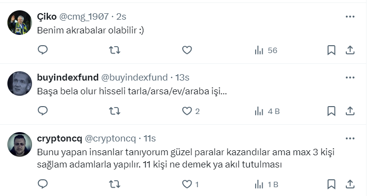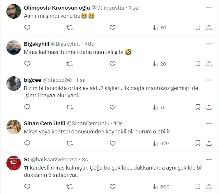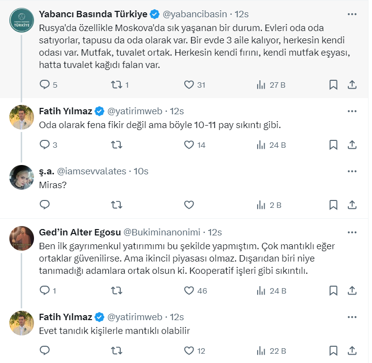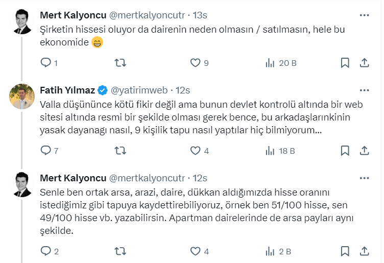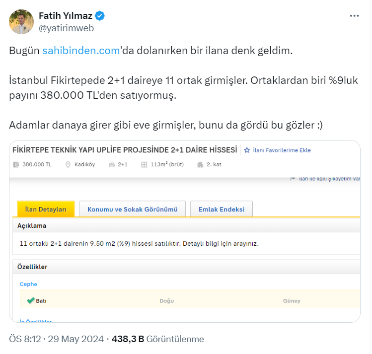 Yatırımcı ve Analist Fatih Yılmaz resmi X hesabı https://x.com/yatirimweb üzerinden yaptığı paylaşımda İstanbul Fikirtepe'de 2+1 daireye 11 ortak girdiklerini belirterek, "Ortaklardan biri yüzde 9luk payını 380 bin TL'den satıyormuş." ifadelerini kullandı.