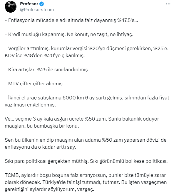 Finans Planlamacısı Profesör lakaplı X sosyal medya kullanıcısı Türkiye'de faiz işinin tutmadığını ve tutmayacağını söyleyerek, ekonomiyi değerlendirdi.