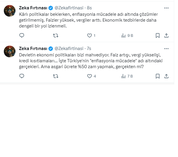 Zeka Fırtınası @Zekafirtinasi Kârlı politikalar beklerken, enflasyonla mücadele adı altında çözümler getirilmemiş. Faizler yüksek, vergiler arttı. Ekonomik tedbirlerde daha dengeli bir yol izlenmeli.