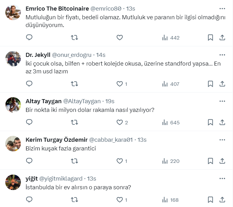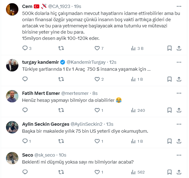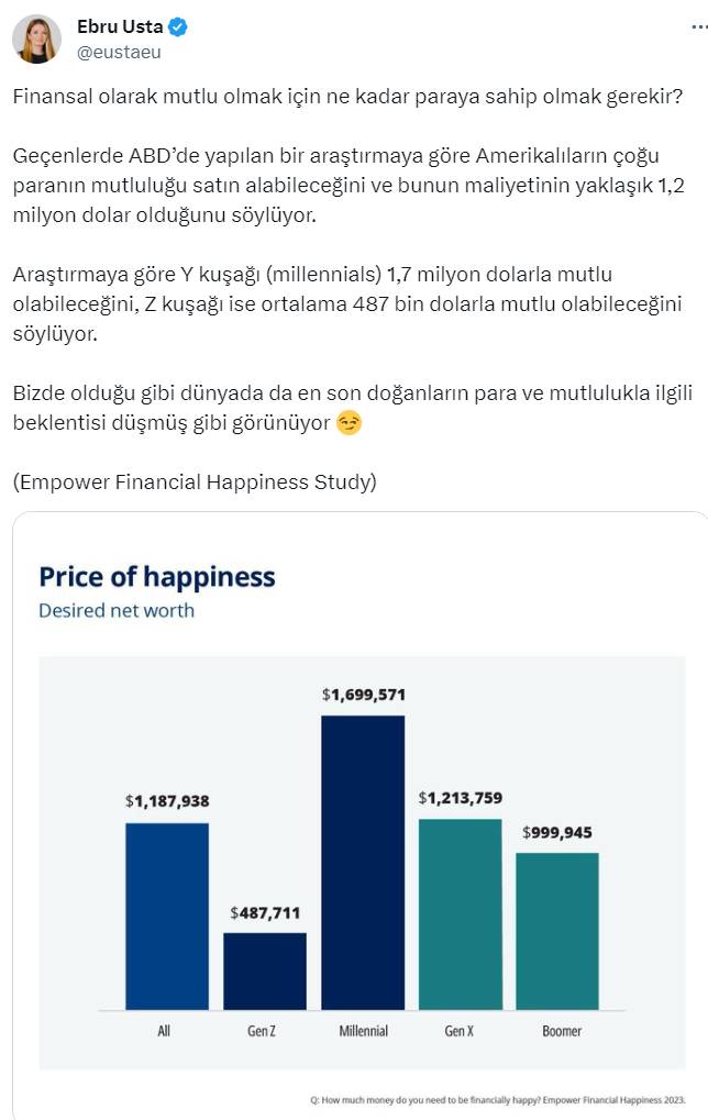 Finans Uzmanı Ebru Usta resmi X hesabı https://twitter.com/eustaeu üzerinden 'Finansal olarak mutlu olmak için ne kadar paraya sahip olmak gerekir?' sorusunun yanıtını paylaştı. İşte Ebru Usta'nın o paylaşımı ve paylaşıma gelen yorumlar...