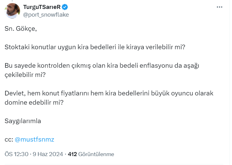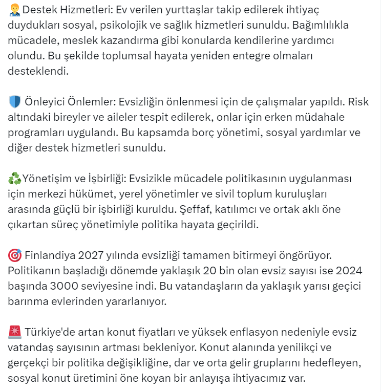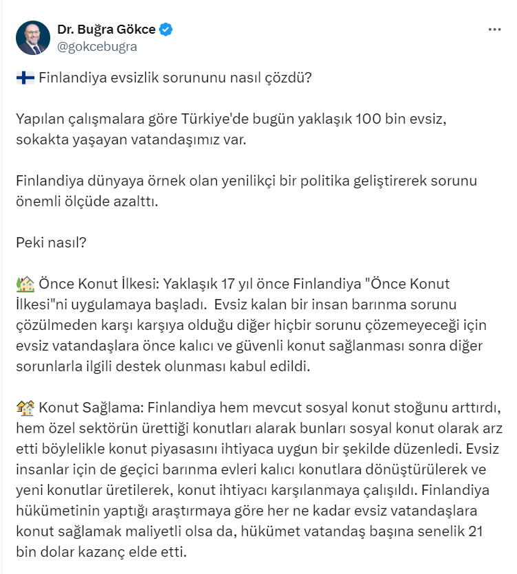 Buğra Gökce resmi X hesabı http://twitter.com/gokcebugra üzerinden yaptığı paylaşımda Finlandiya'nın başarılı evsizlikle mücadele stratejisinin temelinde "Önce Konut İlkesi" yattığını belirterek, bu ilkenin evsiz kalan insanların öncelikle kalıcı ve güvenli konutlara kavuşması gerektiğini vurguladığını kaydetti.