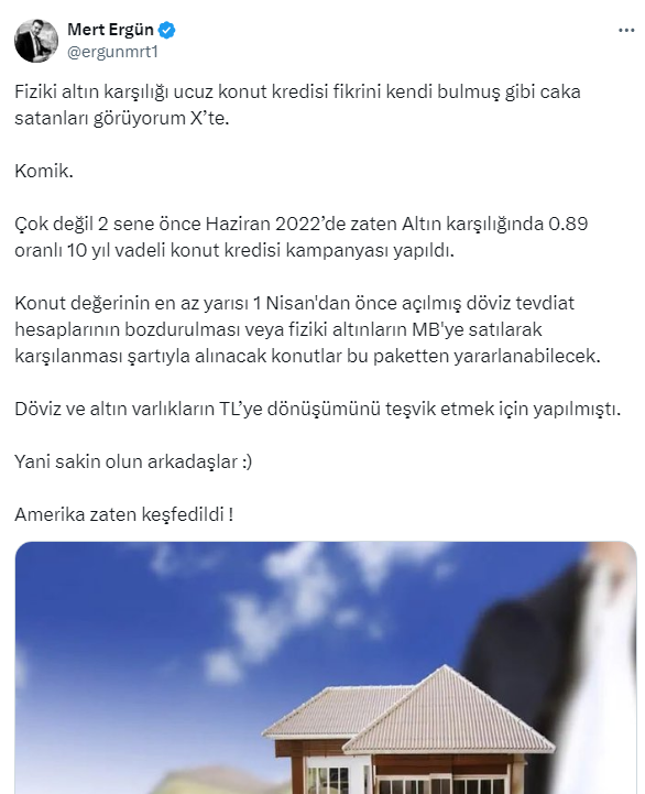 Ergün bu gelişmenin daha önce uygulandığını hatırlatarak ''Yani sakin olun arkadaşlar, Amerika zaten keşfedildi.'' diyerek, fiziki altın karşılığı ucuz konut kredisi fikrini kendi bulmuş gibi açıklama yapanlara seslendi. İşte Girişimci Mert Ergün'ün sosyal medya hesabı X'ten yaptığı o paylaşım...