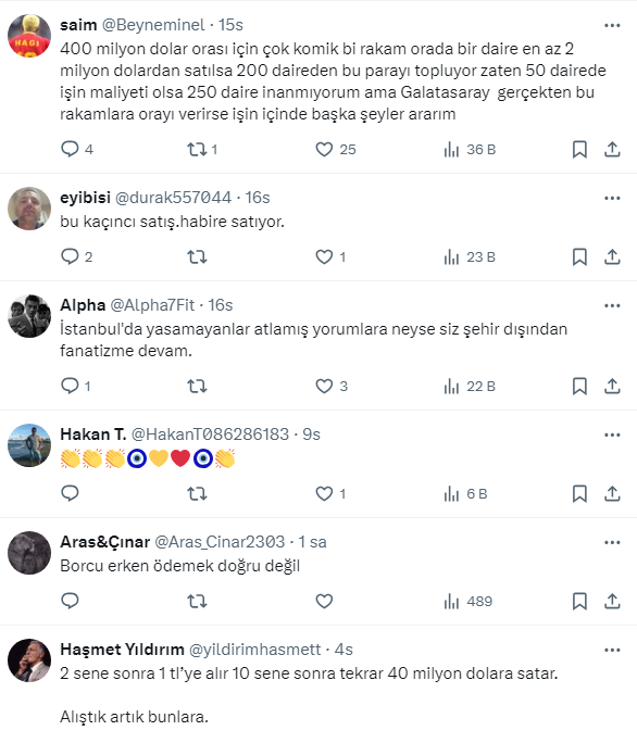 Dev spor kulübü Galataray, Florya'daki arazisini satıyor. Bu satışta, kulübün kasasına 400 milyon doların üzerinde bir para girecek. Sarı Kırmızılı takım Florya’daki arsanın Emlak Konut’a ait 41 dönümlük bölümünü 1 milyar 171 milyon 800 bin liraya satın almış ve Florya’da toplam 62 dönümlük arazinin sahibi olmuştu. Şimdi ise Florya'daki arazinin satışı ile gündeme geldi. Buzzspor sosyal medya hesabı X'ten Galatasary'ın Florya'yı saatığına dair paylaşımda bulundu. Haberin altına ise yüzlerce yorum geldi. İşte o paylaşım ve gelen yorumlar...