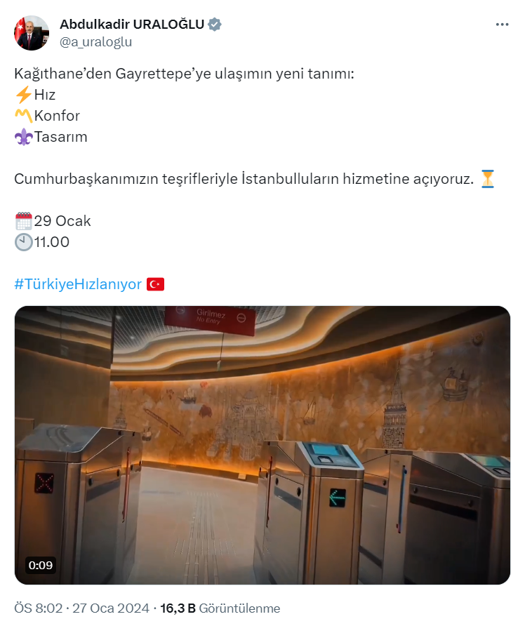 Söz konusu metro hattının açılışının Cumhurbaşkanı Recep Tayyip Erdoğan'ın teşrifiyle yarın saat 11.00'de yapılacağı bilgisini veren Uraloğlu paylaşımında "İstanbul'u kesintisiz, konforlu, yerli ve milli raylı sistem ağlarıyla donatmaya devam ediyoruz. İnşa ettiğimiz geleceğe miras eserler ile Türkiye hızlanıyor" ifadelerini kullandı.