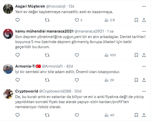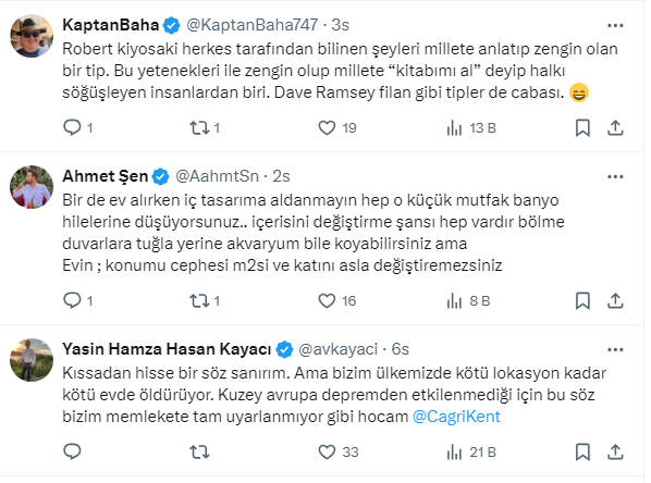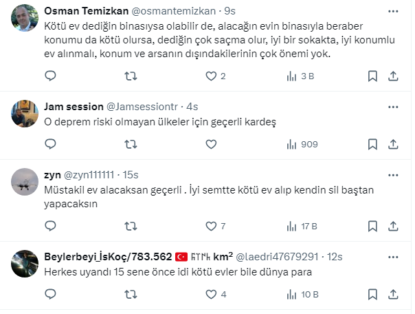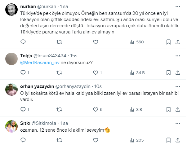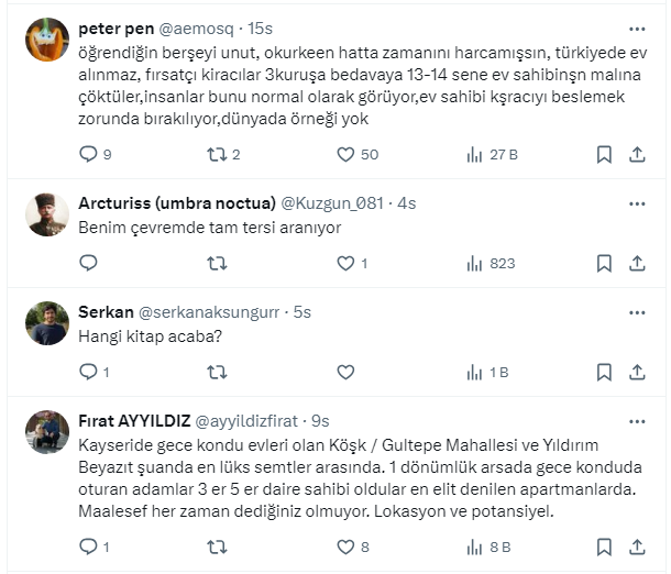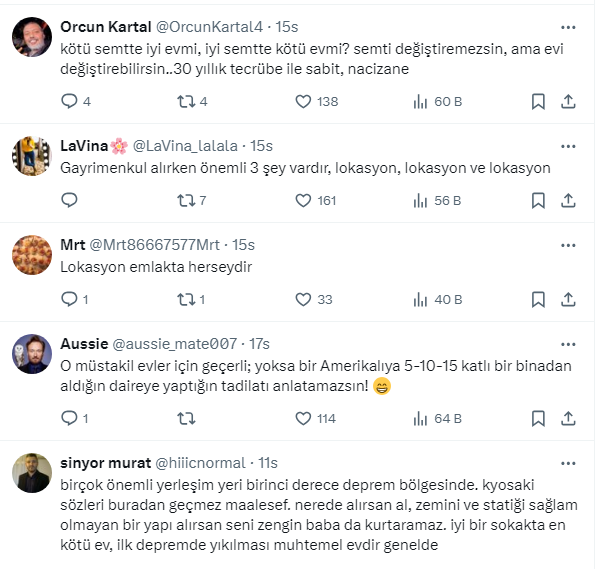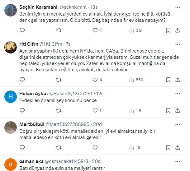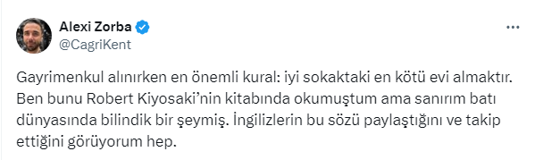 Alexi Zorba isimli kullanıcı https://twitter.com/CagriKent X sosyal medya hesabından yaptığı paylaşımda, gayrimenkul alırken en önemli kuralın en iyi sokaktaki en iyi evi almak olduğunu söyledi: “Gayrimenkul alınırken en önemli kural: iyi sokaktaki en kötü evi almaktır. Ben bunu Robert Kiyosaki’nin kitabında okumuştum ama sanırım batı dünyasında bilindik bir şeymiş. İngilizlerin bu sözü paylaştığını ve takip ettiğini görüyorum hep.”