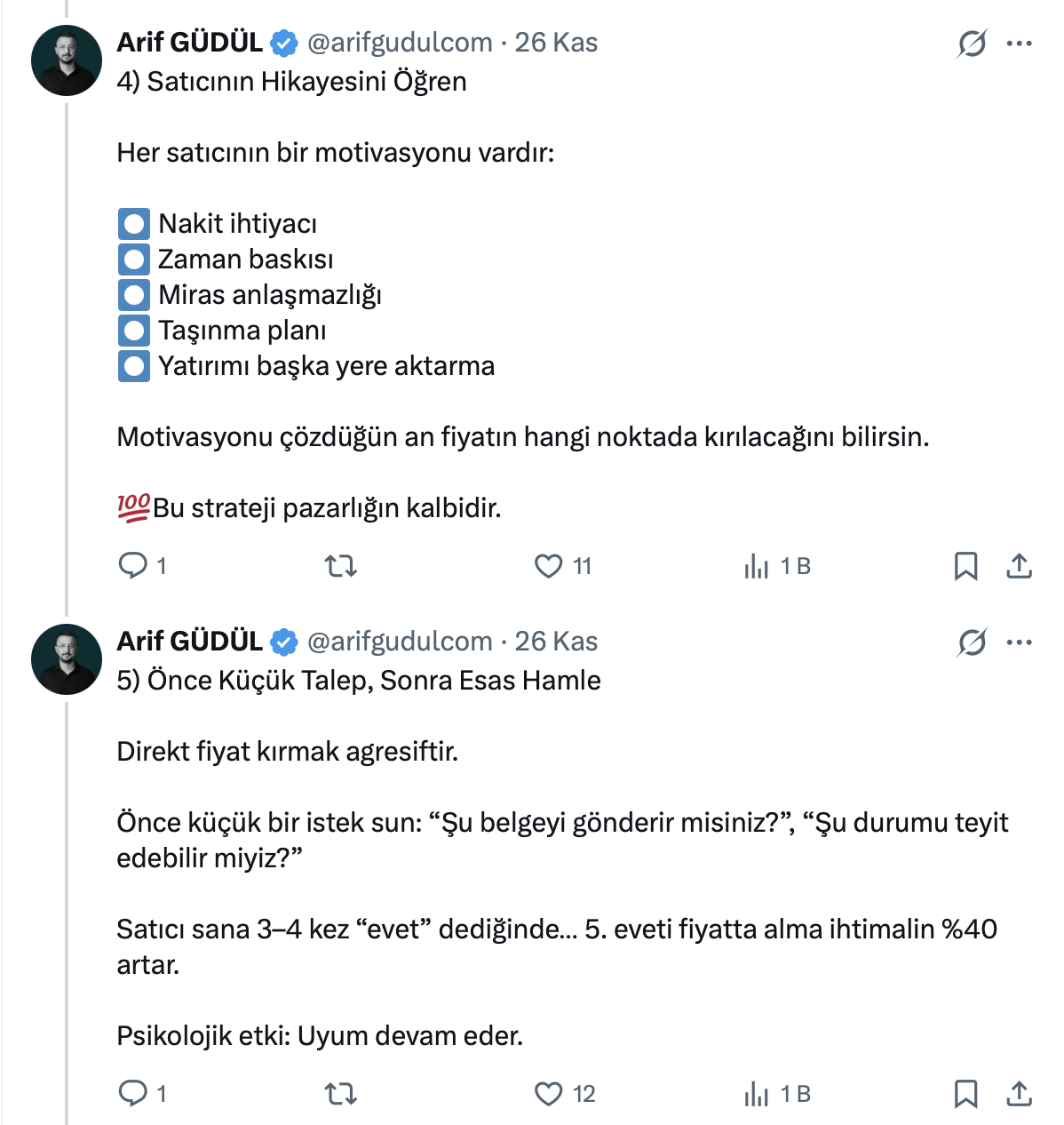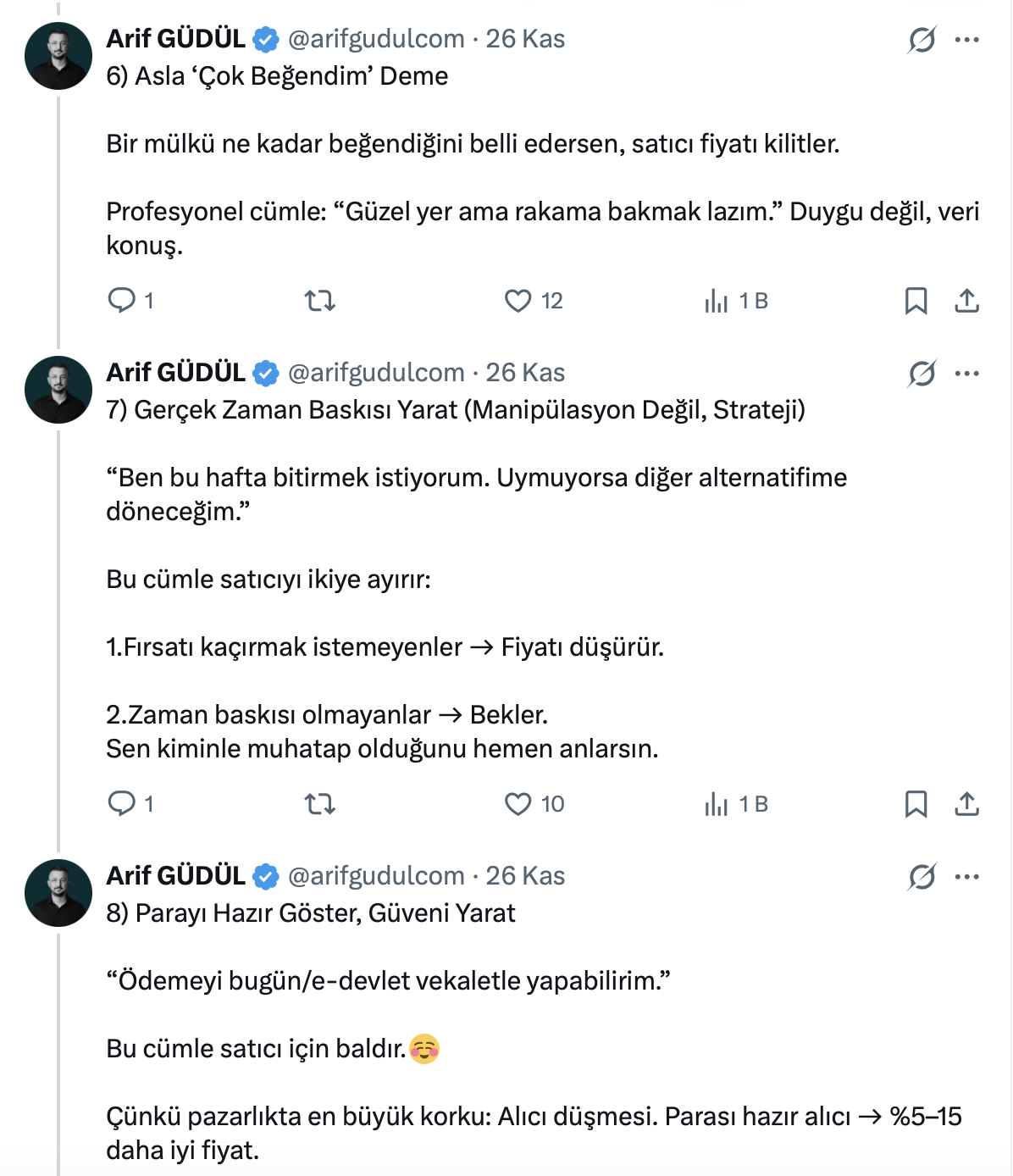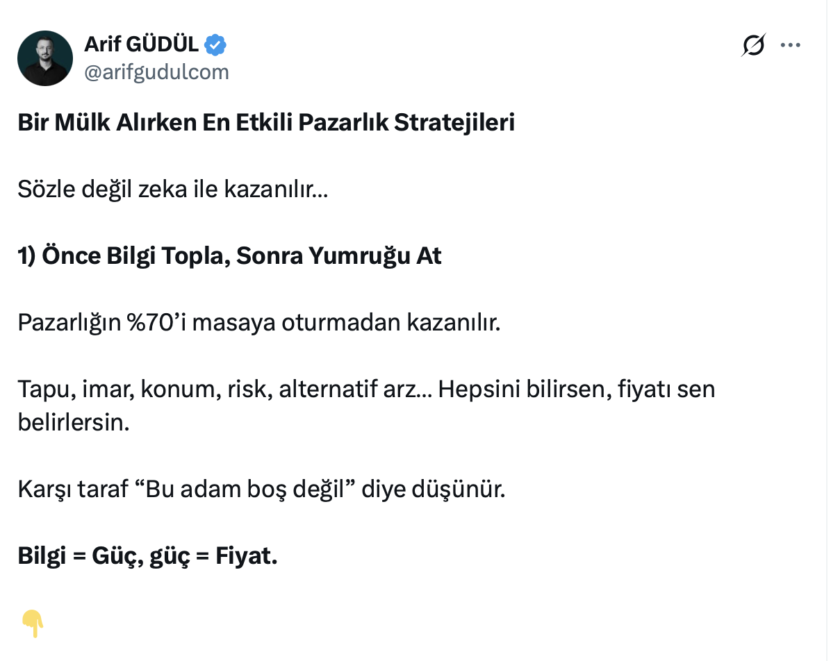 Toprak Yatırımcısı ve talepbul'un Yönetim Kurulu Başkanı Arif Güdül resmi sosyal medya hesabı üzerinden yaptığı paylaşımda bir mülk alırken en etkili pazarlık stratejilerini açıkladı.
