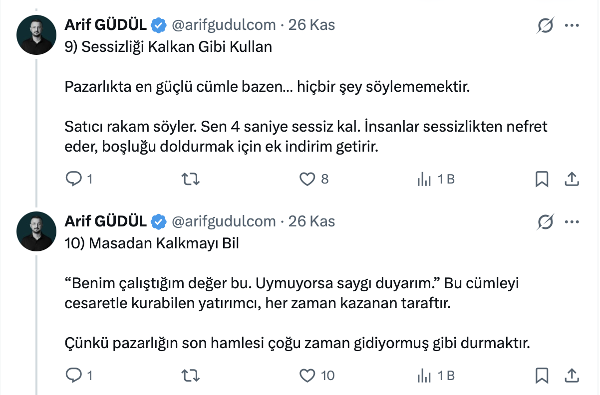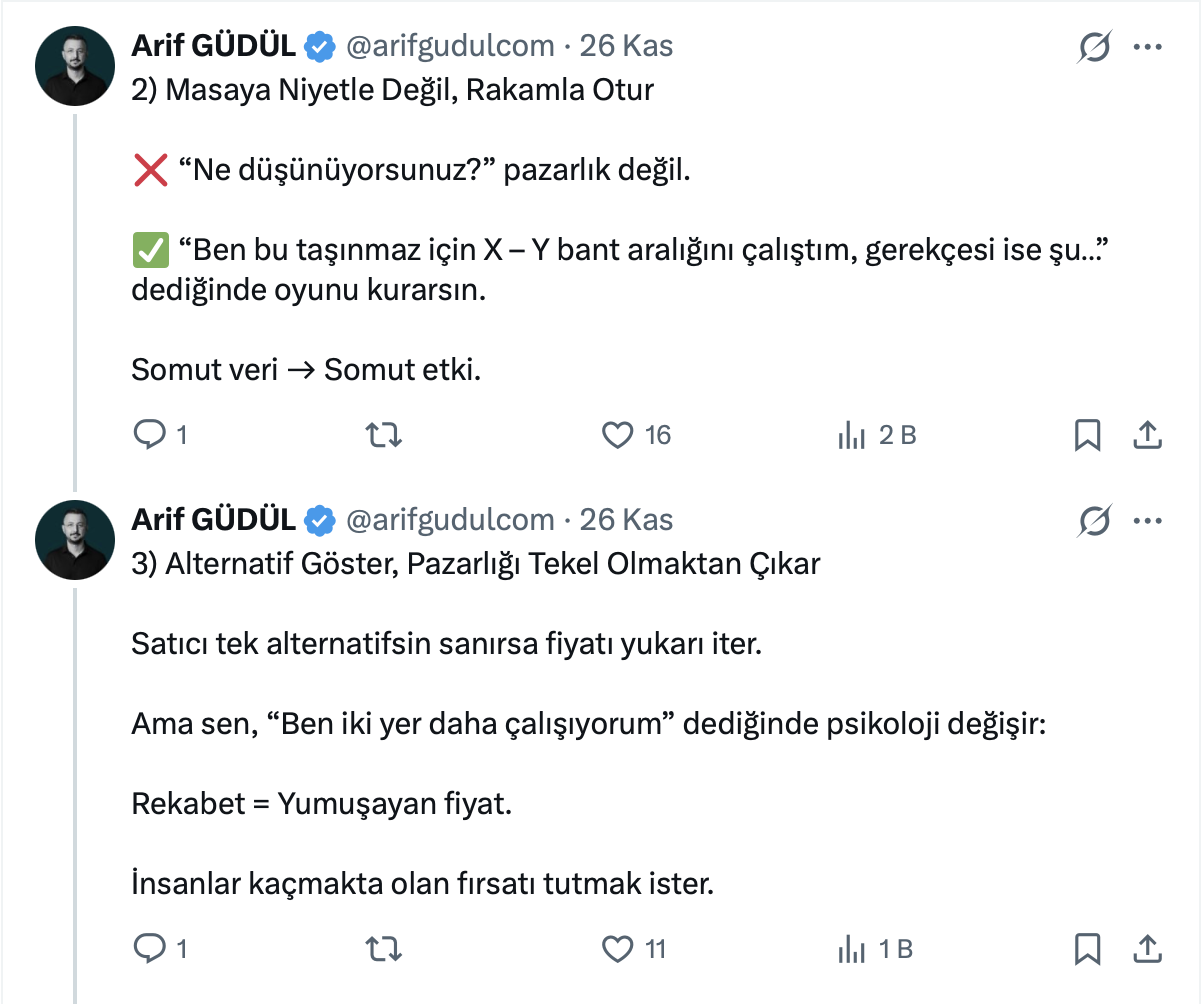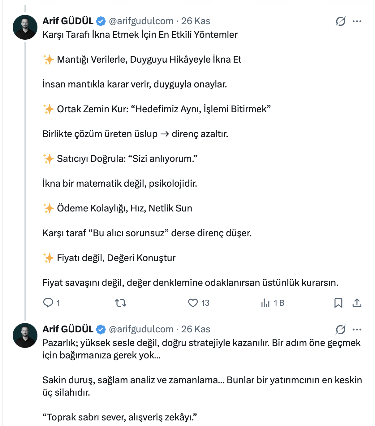 Toprak Yatırımcısı ve talepbul'un Yönetim Kurulu Başkanı Arif Güdül resmi sosyal medya hesabı üzerinden yaptığı paylaşımda bir mülk alırken en etkili pazarlık stratejilerini açıkladı.