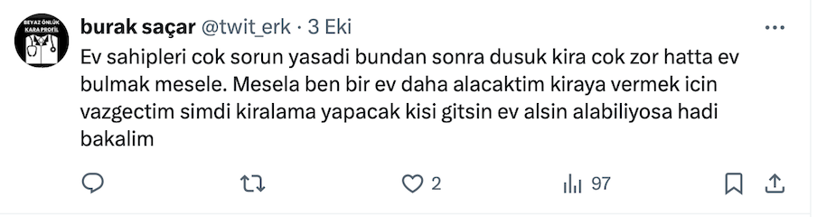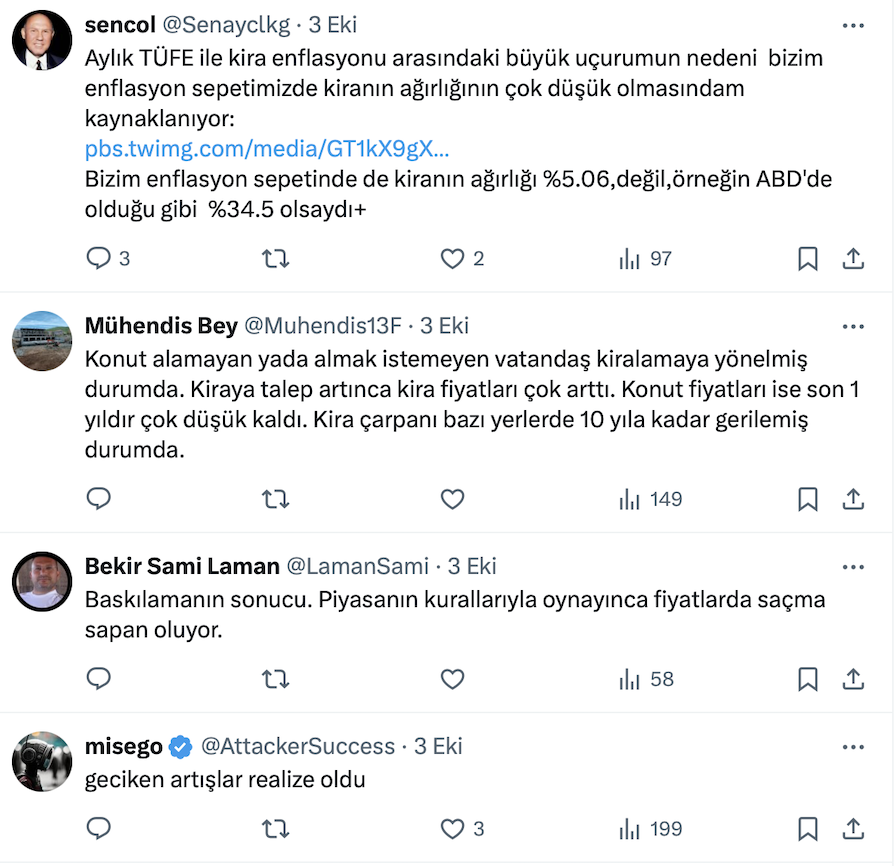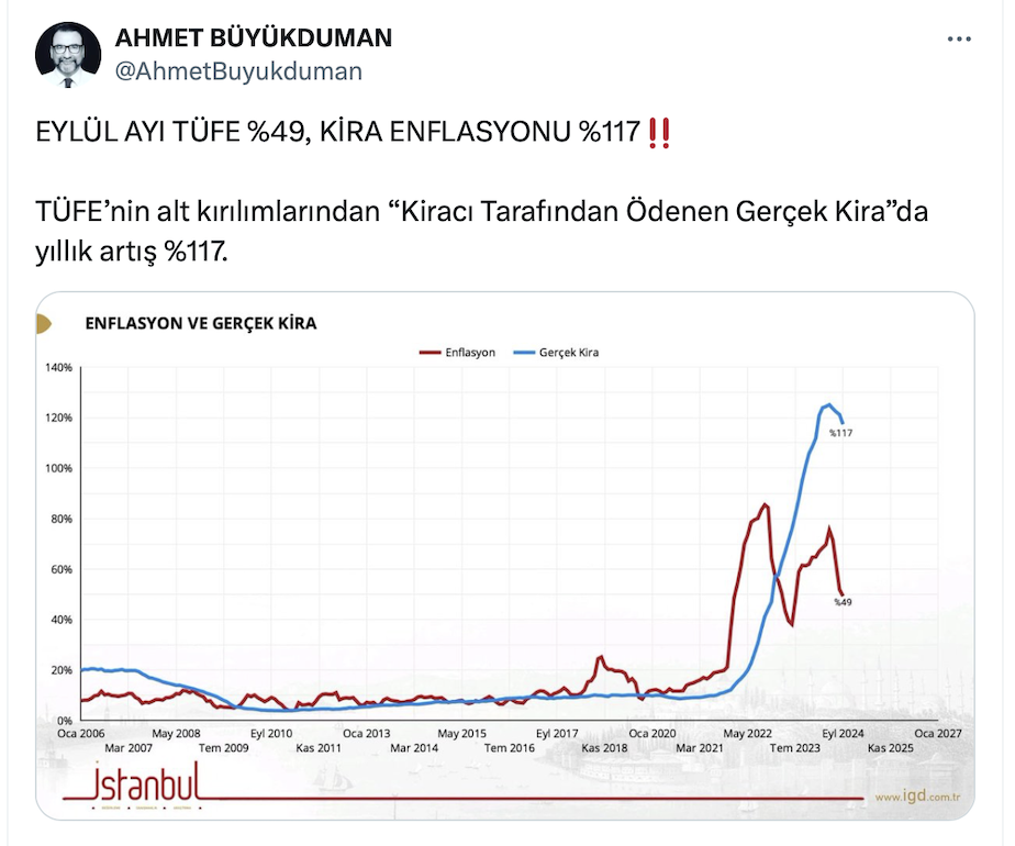 Ahmet Büyükduman yaptığı paylaşımda “TÜFE’nin alt kırılımlarından “Kiracı Tarafından Ödenen Gerçek Kira”da yıllık artış %117” ifadelerini kullandı.