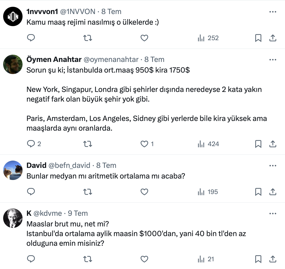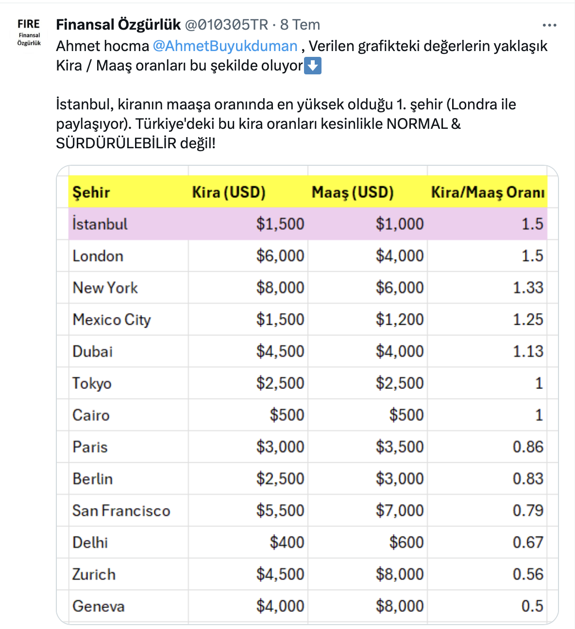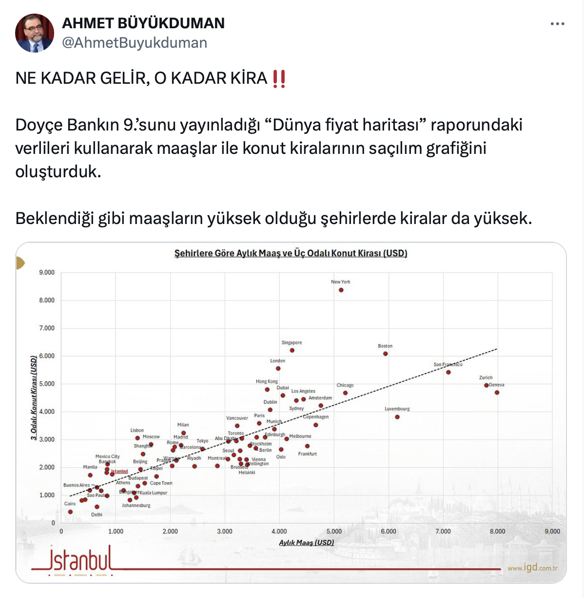 Ahmet Büyükduman resmi X hesabı https://x.com/AhmetBuyukduman üzerinden yaptığı paylaşımda maaşların yüksek olduğu şehirlerde kiraların da yüksek olduğunu söyledi.