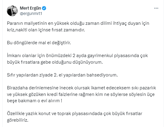 Nakti olanlar için gayrimenkulde fırsat dönemi olduğunu belirten girişimci Mert Ergün https://x.com/ergunmrt1 X sosyal medya hesabından yaptığı paylaşımda, özellikle önümüzdeki 2 ayın büyük fırsatlara gebe olduğuna dikkat çekti..