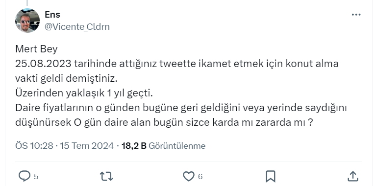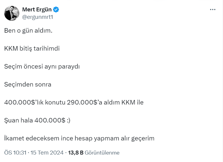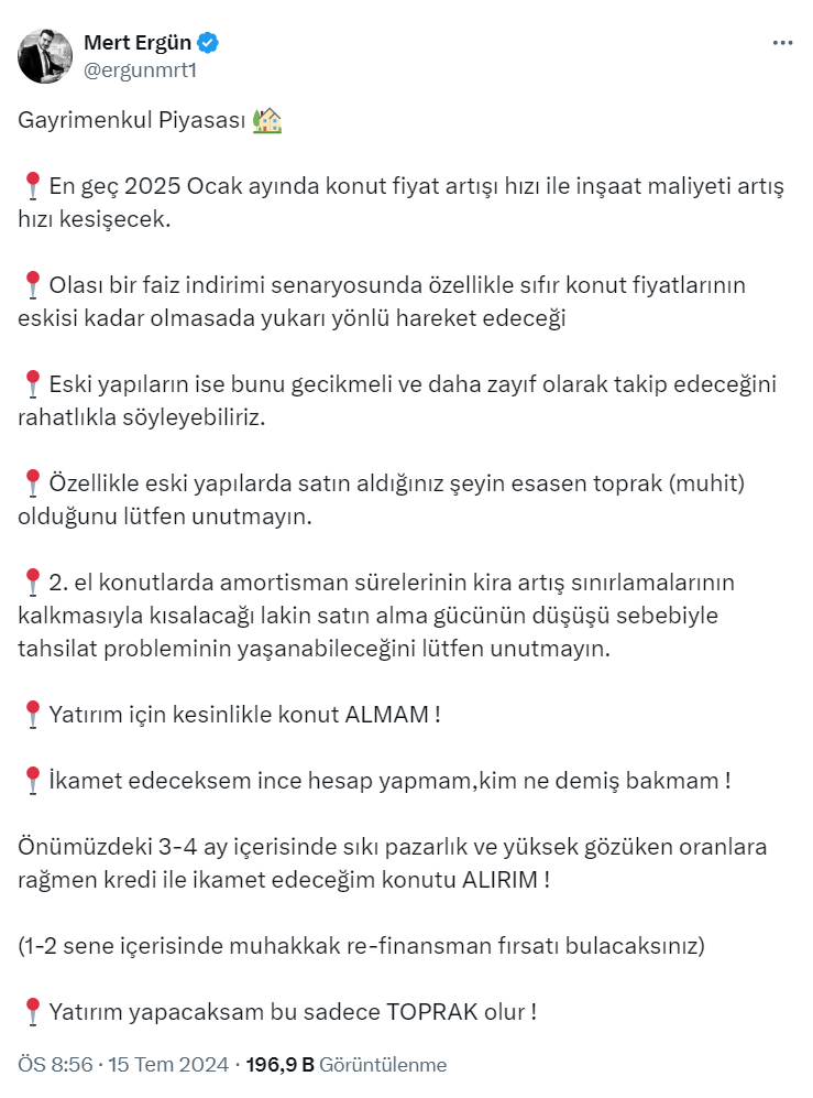 Girişimci Mert Ergün, https://x.com/ergunmrt1 resmi X sosyal medya hesabı üzerinden gayrimenkul piyasası ile ilgili önemli açıklamalar yaparak, olası bir faiz indirimi senaryosunda özellikle sıfır konut fiyatlarının eskisi kadar olmasa da yukarı yönlü hareket edeceğini söyledi.