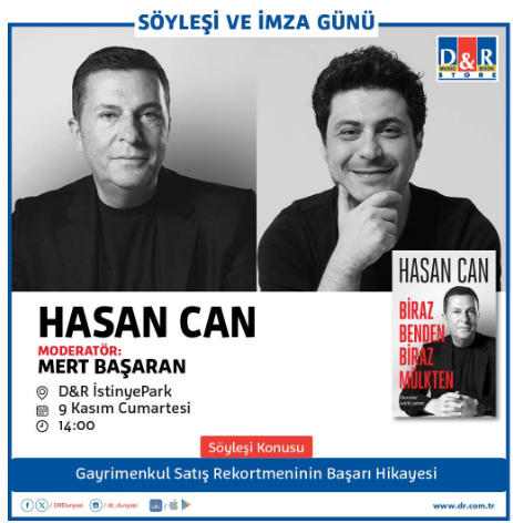 Gayrimenenkul satış rekortmeni Re/Max 7Tepe ofisi sahibi Hasan Can gayrimenkul dünyasındaki deneyimlerini kaleme aldığı “Biraz Benden Biraz Mülkten” kitabının imza töreni Saat 14:00’te D&R İstinyePark mağazasında gerçekleştirilecek.