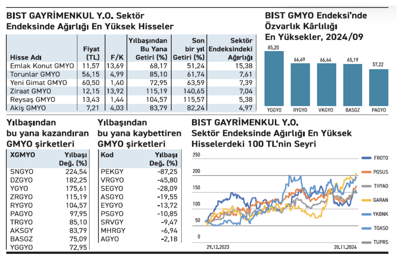 BIST GMYO Endeksi (XGMYO) yılbaşından bu yana yüzde 35,50 yükseliş gösterdi. Sektörde işlem gören hisseler içerisinde yılbaşından bu yana yüksek kazanç sağlayanlar da bulunuyor. Sinpaş GMYO yüzde 224,54 ile zirvede yer alırken, Ziraat GMYO ve Reysaş GMYO yüzde 100’ün üzerinde kazandırdı. Gözlenen performans, sektöre yönelik artan ilginin somut göstergesi niteliğinde.”