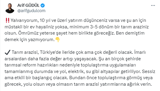 Toprak Yatırımcısı ve talepbul'un Yönetim Kurulu Başkanı Arif Güdül, https://x.com/arifgudulcom X sosyal medya hesabından yaptığı paylaşımda, 10 yıl ve üzeri yatırım yapmayı düşünenlere mutlaka tarım arazisi almalarını önerdi. Güdül tarım arazilerinin, gelecekte arsadan daha çok değerleneceğini belirterek, nedenlerini açıkladı. İşte Güdül’ün paylaşımı…