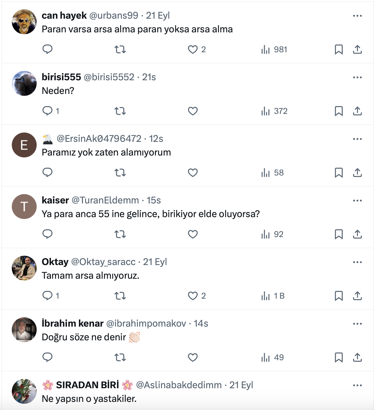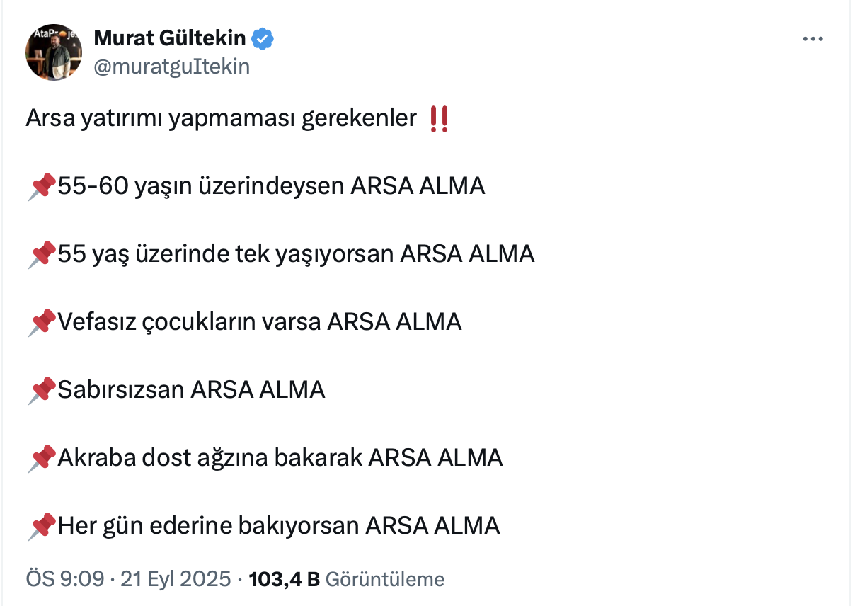 Gayrimenkul Uzmanı Murat Gültekin resmi sosyal medya hesabı üzerinden yaptığı paylaşımda kimlerin arsa yatırımı yapmaması gerektiğini açıkladı.