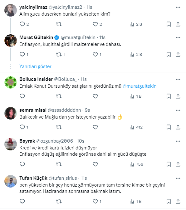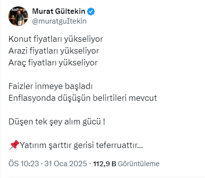 Gayrimenkul uzmanı Murat Gültekin sosyal medya hesabından gayrimenkul piyasası ile ilgili merak edilenleri açıkladı. Gültekin, faizlerin düşmesi ile konut ve araz fiyatlarının yükseldiğini tek düşenin vatandaşların alım gücü olduğunu söyledi. İşte Murat Gültekin'in sosyal medya hesabı X'ten yaptığı o paylaşım...