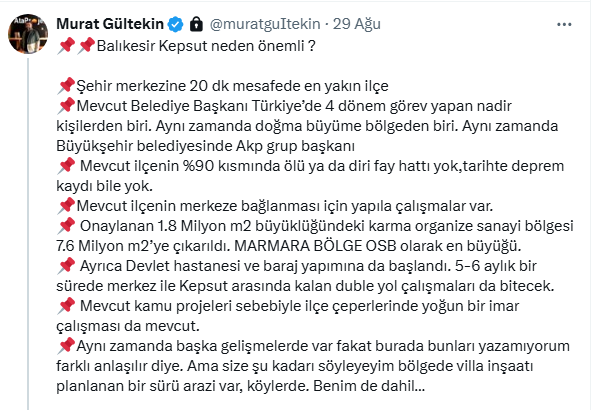 İşte Murat Gültekin'in Balıkesir Kepsut ile ilgili sosyal medya hesabı X'teki o açıklaması...