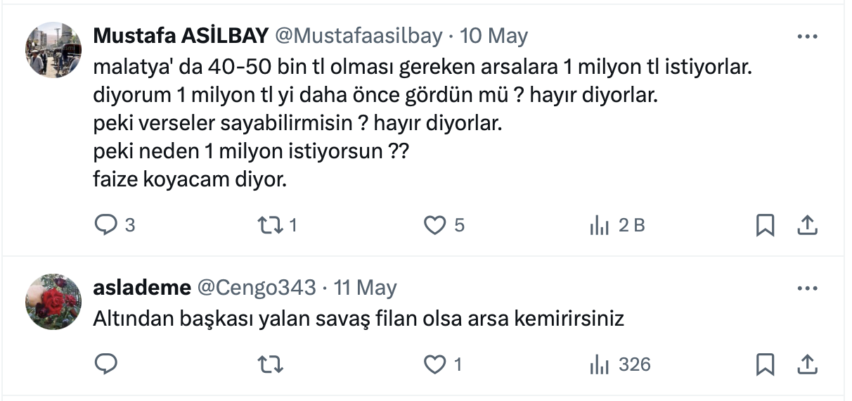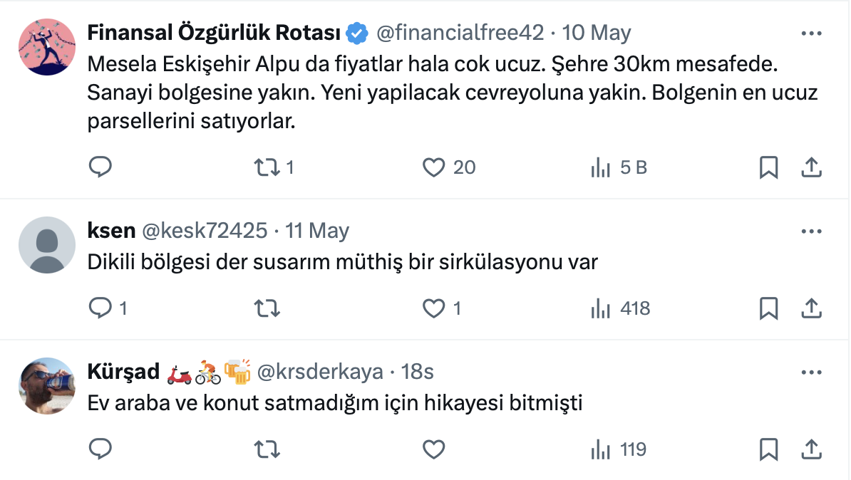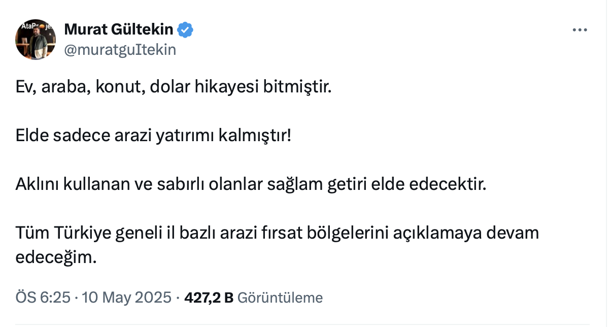 Gayrimenkul Uzmanı Murat Gültekin, resmi sosyal medya hesabı https://x.com/muratguItekin yaptığı paylaşımda ev, araba, konut, dolar hikayesinin bittiğini belirterek, “Elde sadece arazi yatırımı kalmıştır” dedi.