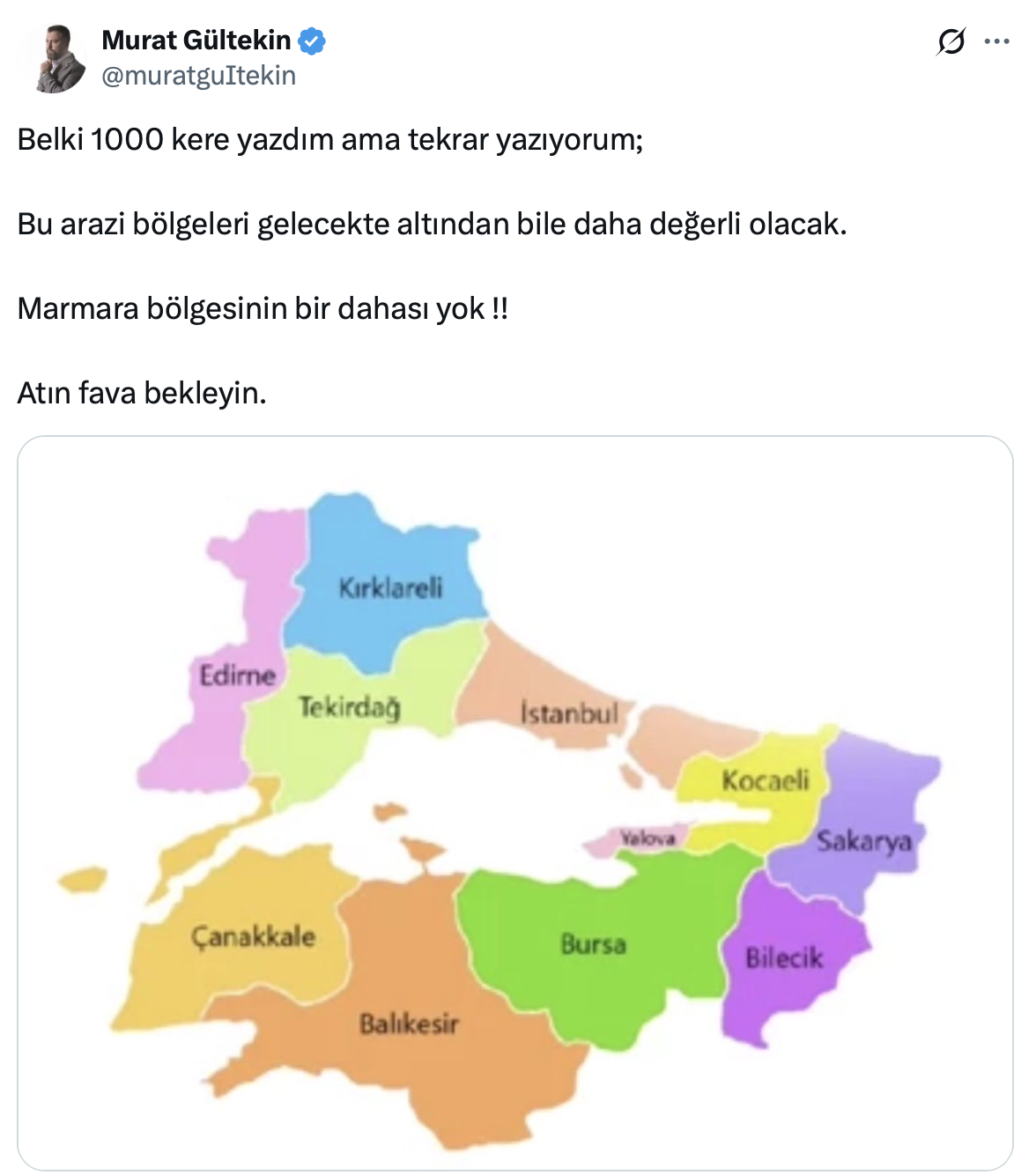 Gayrimenkul Uzmanı Murat Gültekin, resmi sosyal medya hesabı https://x.com/muratguItekin yaptığı paylaşımda gelecekte altından bile daha değerli olarak arazi bölgelerini açıkladı.