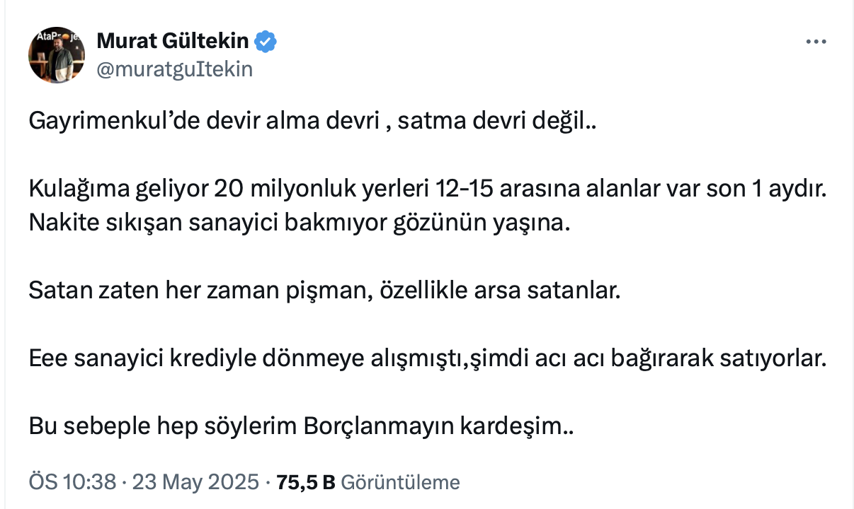 Gayrimenkul Uzmanı Murat Gültekin resmi sosyal medya hesabı https://x.com/muratguItekin üzerinden yaptığı paylaşımda “Gayrimenkul’de devir alma devri , satma devri değil” dedi.
