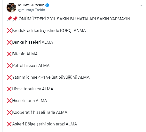 Gayrimenkul uzmanı Murat Gültekin, sosyal medya hesabından yatırımcıları önümüzdeki iki yılda hisseli tarla ve ev almamaları konusunda uyardı.