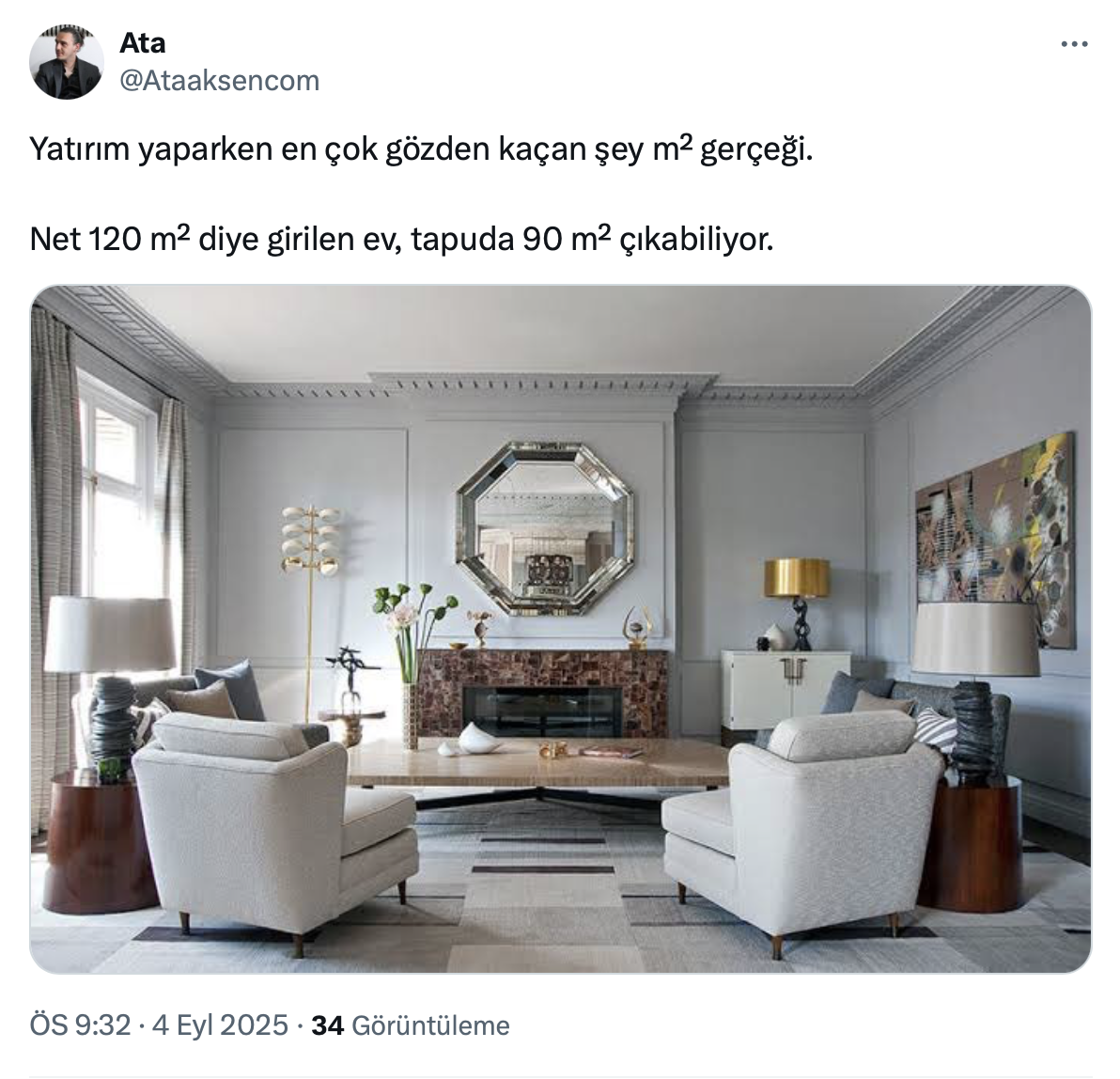 Ata Aksen yaptığı paylaşımda yatırım yaparken en çok gözden kaçan şeyin metrekare gerçeği olduğunu belirterek, “Net 120 metrekare diye girilen ev, tapuda 90 metrekare çıkabiliyor” dedi.