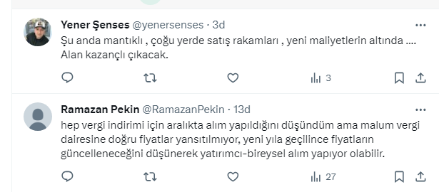 Ramazan Pekin @RamazanPekin: hep vergi indirimi için aralıkta alım yapıldığını düşündüm ama malum vergi dairesine doğru fiyatlar yansıtılmıyor, yeni yıla geçilince fiyatların güncelleneceğini düşünerek yatırımcı-bireysel alım yapıyor olabilir.