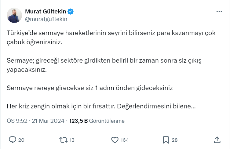 Paylaşımında "Türkiye’de sermaye hareketlerinin seyrini bilirseniz para kazanmayı çok çabuk öğrenirsiniz." diyen Murat Gültekin, "Sermaye; gireceği sektöre girdikten belirli bir zaman sonra siz çıkış yapacaksınız." ifadelerini kullandı.